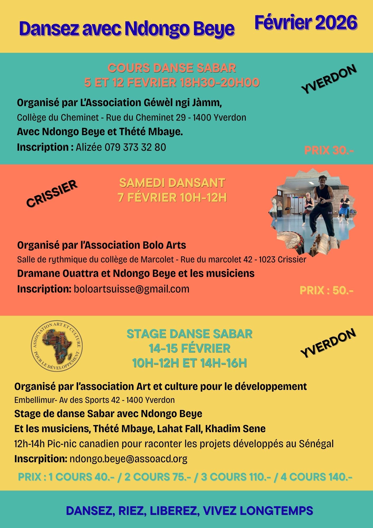 Soirée de Soutien le 18 novembre 2023 Yverdon Salle de la Passerelle Stage danse Sabar de 10h à 12h00 tenu par Ndongo Beye Repas pour les stagaires et artistes Stage danse Saouruba de 13h00 à 15h00 tenu par [...]