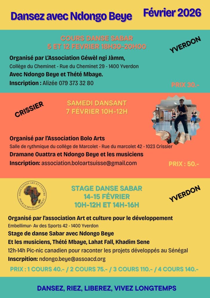 Février 2026 – Cours, stage de Danse Sabar Par Ndongo Beye|2026-01-17T17:51:23+01:00janvier 4th, 2026|Activités Suisse, Actualité, Cours, Evénement|Commentaires fermés sur Février 2026 – Cours, stage de Danse Sabar Partager sur la plateforme de votre choix FacebookXRedditLinkedInWhatsAppTelegramTumblrPinterestVkXingEmail Articles similaires Soirée de soutien AACD Yverdon Galerie Soirée de soutien AACD Yverdon Portraits des Goliath Galerie Portraits des Goliath Stage de danse Sabar Yverdon – 2023-2024 Galerie Stage de danse Sabar Yverdon – 2023-2024 Yelen festival 2023 Galerie Yelen festival 2023 Afrique en ville 2023 Afrique en ville 2023
